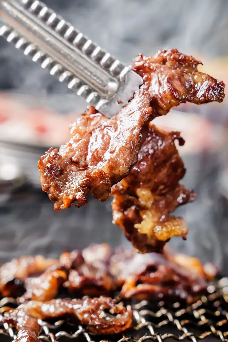 ·炭烤/铁板鲜牛肉,外皮焦香、内里爆汁,搭配秘制酱料,裹上生菜或紫苏叶,一口封神