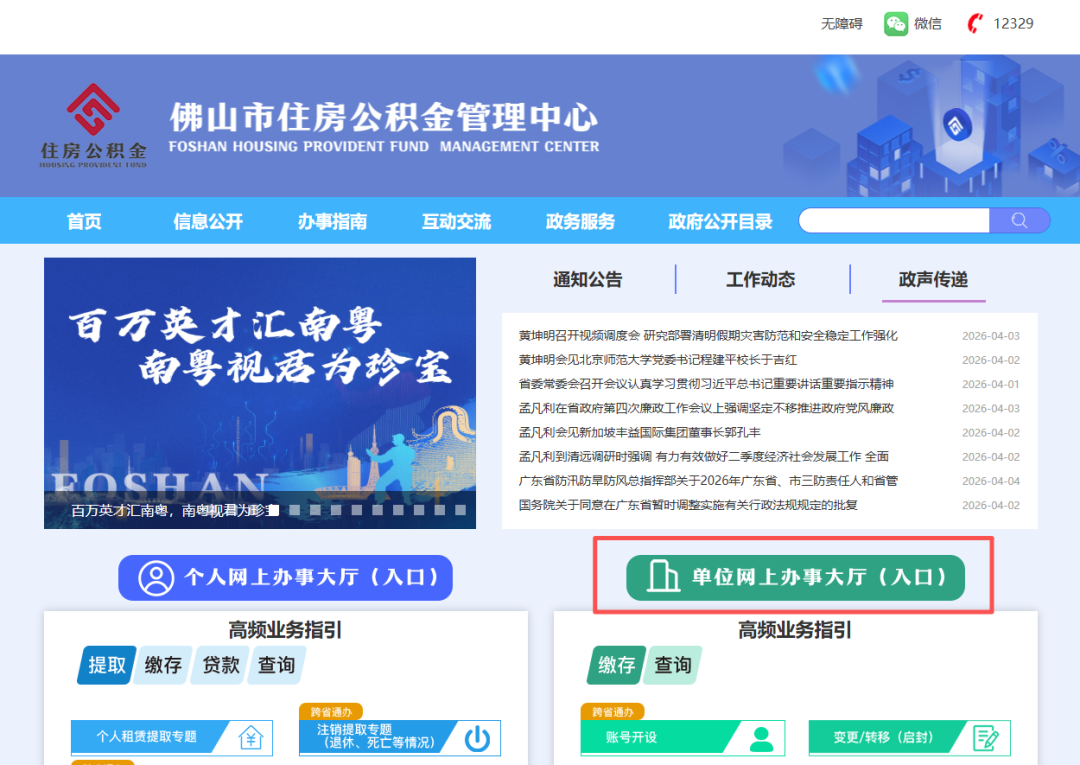 一、请登录佛山市住房公积金管理中心网站(https://fsgjj.foshan.gov.cn/),点击“单位网上办事大厅(入口)”。