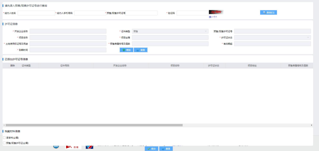 四、确认协查返回的预售/现售许可证信息,如返回的许可证信息不完整,可根据实际材料自行录入,点击“增加”新增该许可证号对应的项目;支持一次申请备案多个项目,以“已添加许可证号信息”列表清单为准。
