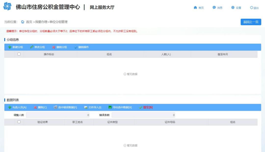 二、单位经办人登录网厅,首页通过“我要办理”进入到办理模块,点击“单位分组管理”进入单页面,单位可对单位职工进行分组管理。系统支持勾选操作和批量导入职工分组管理数据。