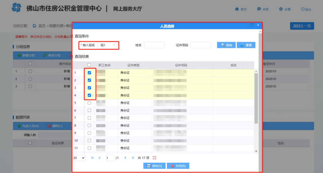 六、勾选人员:单位存在分组信息后,点击“勾选人员”可进行人员分组调整。先选择转入组名,再勾选职工,最后点击“保存”可将人员转入到分组中。重复操作“勾选人员”操作,直到单位下所有人员都在分组中。