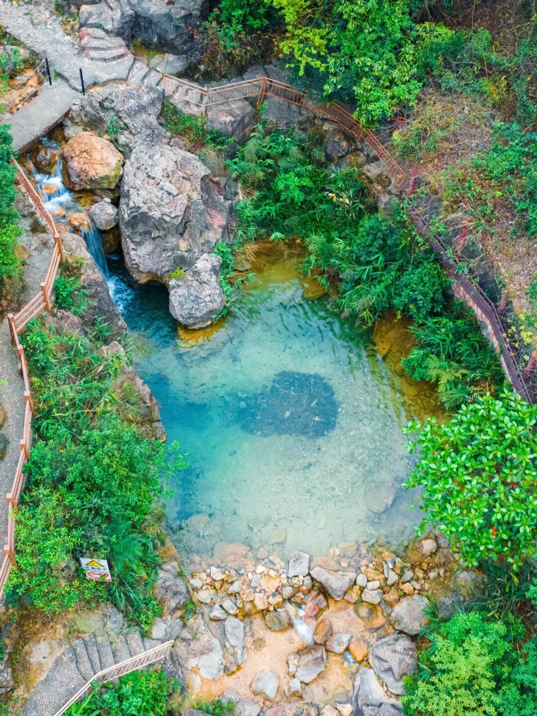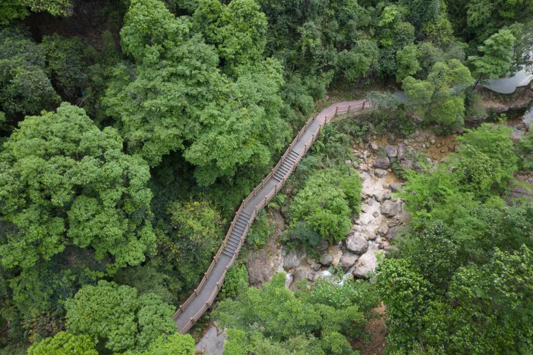 结束溯溪,我们沿着1573步道悠闲登山,步道平缓舒适,沿途打卡庆云洞、绿水潭、森林之彩3D彩绘石、庆云瀑布,每一步都被自然包围。