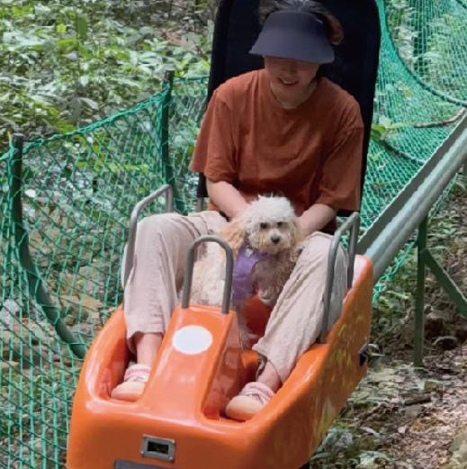 下山时体验银溪飞车,华南唯一森林单轨滑车,全长500米,平稳又刺激,我乖乖待在铲屎官身边,感受林间飞驰的快乐。