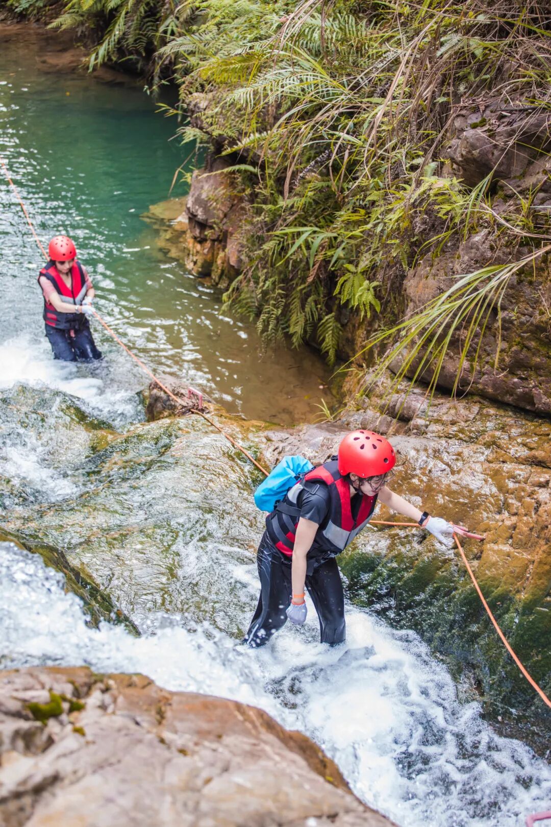 2. 蓝线溯溪支持宠物携行,水质干净、关卡丰富,平缓路段多,小型犬部分路段可由主人协助。