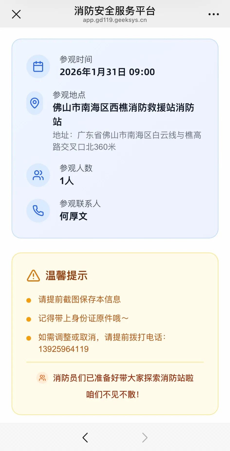 3.预约提交后,后台工作人员将根据各消防救援站的实际情况,对申请参观的信息进行审核,审核通过后将会通过电话或短信反馈预约结果。