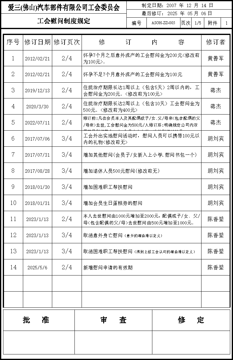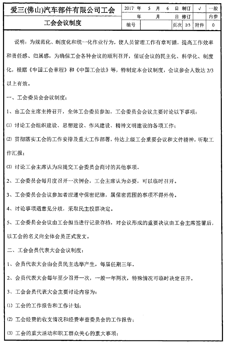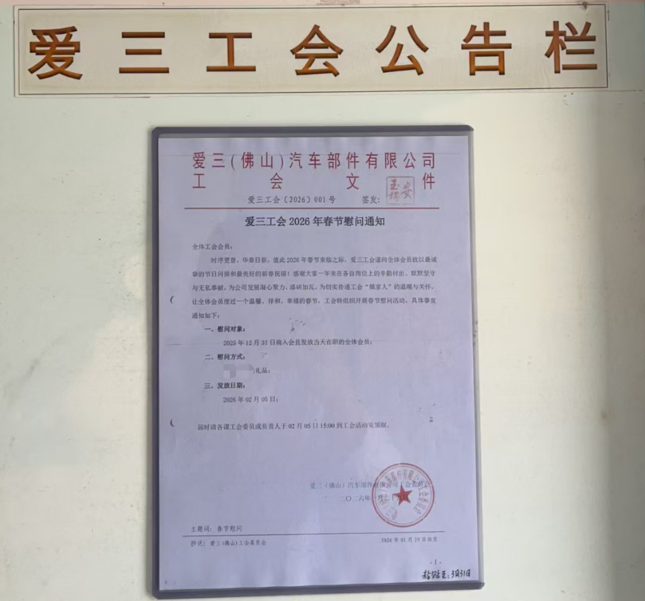 爱三公司坚持以提高员工生活水平,建立和谐劳动关系为宗旨,实现企业与员工利益共同发展的良好局面。 在公司活动方面,为了丰富员工的业余生活,提高职工的凝聚力和归属感,公司开展了丰富的活动,有新年会、家庭日、旅游、开工大吉抽奖活动、捡垃圾环保活动、三八女职工慰问、瑜伽活动、跑团活动等。 公司活动展示 爱三(佛山)汽车部件有限公司工会委员会(简称:爱三工会) 成立于2007年11月5日,爱三工会一路走来一直秉持着“以人为本.体面劳动”的工作理念,为我工会各项工作的开展指明了方向。近年来,爱三工会在大良街道总工会的领导下,和公司方的大力支持下,经过全体会员的积极努力,工会工作做出了以下成绩。 一、全面加强员工专业培训,提高员工素质 爱三工会恒常组织职工深入学习贯彻党的二十大精神,加强对员工的职业技术培训,开展各项学习活动,不断提高员工队伍的整体素质。 爱三工会组织开展全公司岗位技能竞赛。 爱三工会积极组织员工参加上级工会举办的各类劳动技能竞赛。 电焊工比赛 二、加强工会自身建设,不断提高工作水平 1.健全畅通工会上下级宣传渠道,保障工会各项工作有序开展,确保信息传达到每个员工。宣传途径有:微信公众号、微信群、邮箱、厂区内工会公告栏。 2. 加强制度建设,明确工作职责。以《工会法》为基础,不断完善涵盖入会制度、财务管理制度、会议制度、慰问制度等各项规章制度,更好的服务于工会会员。 三、以人为本,关心员工,为员工谋福利 1.办好员工福利:工会始终坚持用心做好员工福利保障工作,在春节、端午、中秋等中华民族传统佳节,为全体职工精心发放节日慰问品,以实用暖心的生活用品传递组织关怀,让职工在浓浓节日氛围中感受家一般的温暖。同时积极开展职工家庭日活动,为会员送上精美礼品,搭建企业与职工家庭的沟通桥梁,不断增强职工的归属感、幸福感,营造和谐温暖、积极向上的良好氛围。 2.维护员工合法权益,收集员工的意见(含:福利待遇方面、安全方面、环境方面等),反馈到公司,争取各项合法权益得到解决。 3.关心员工身心健康,建立健身室、爱心妈妈小屋;开展徒步、拔河、乒乓球赛、桌球赛、篮球赛等活动;开展无偿献血、中医健康服务进企业活动(免费)。 4.建立健全工会慰问制度,对结婚、生子、退休、住院等的会员进行慰问,工会与公司还设立了《救助基金会》,为重疾的员工进行帮扶。