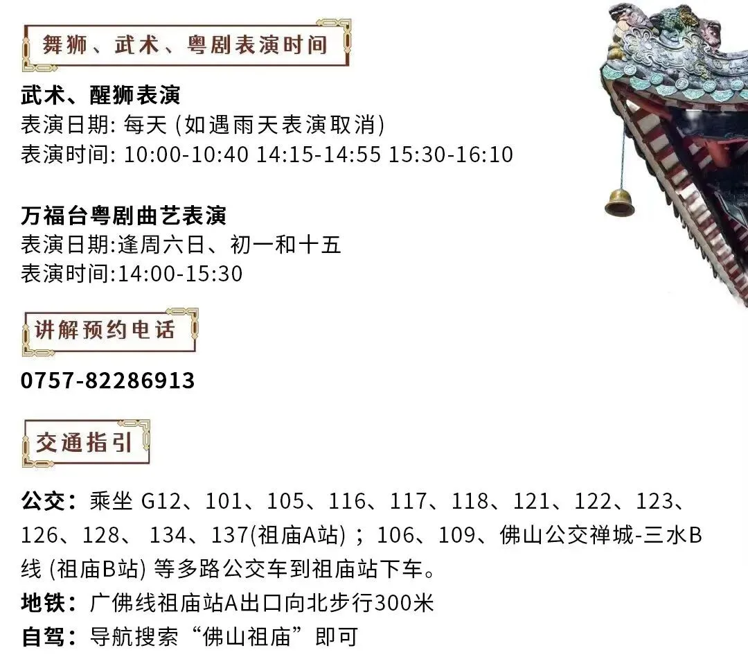 2、8:30-10:40,祖庙博物馆古建筑群(正殿、前殿、三门前、灵应牌坊、万福台前广场等区域)暂停对外开放。