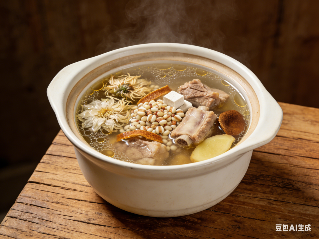 准备干木棉花10g、炒薏米20g、茯苓15g、猪骨300g、陈皮1小片、姜2片。猪骨焯水;木棉花略泡洗。2所有材料下锅,大火煮沸转小火煲1–1.5小时,出锅前加盐。此汤功效清热祛湿、利水消肿、健脾化浊,适合岭南雨季湿热。舌苔黄腻、口苦、身体黏腻、皮肤易长痘、湿疹、小便偏黄、久坐少动、湿气重且偏热者可以尝试。
