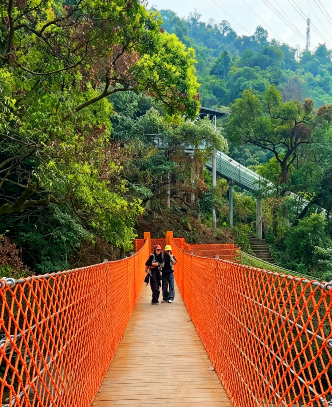 古树索桥全长200米,穿梭百年古树之间,漫步空中,尽享林间清风与满目苍翠。