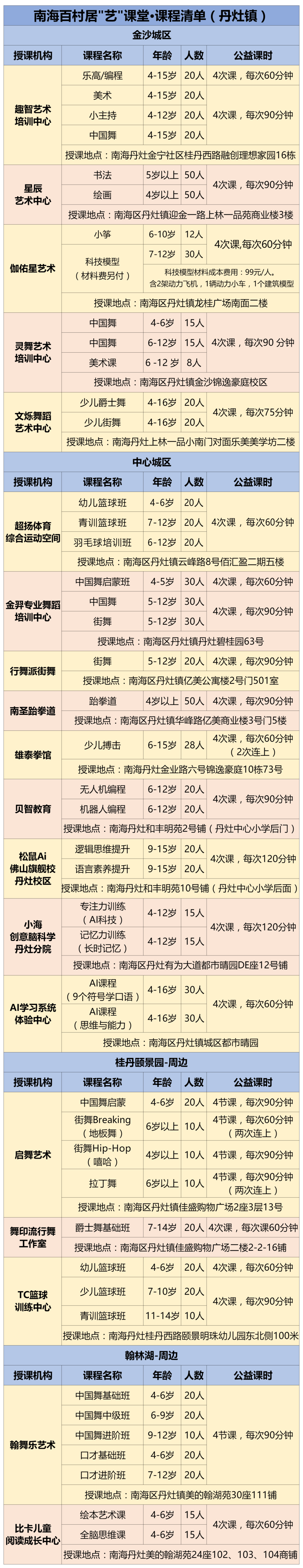 丹灶家长看过来! 想给孩子一个充实又快乐的周末 推荐你来参与 南海百村居“艺”课堂 40+门公益课堂 艺术、体育、科技样样都有 每人可任选3科,共12次课 让孩子边学、边玩、边交朋友 事不宜迟一起去看 ↓ ↓ ↓