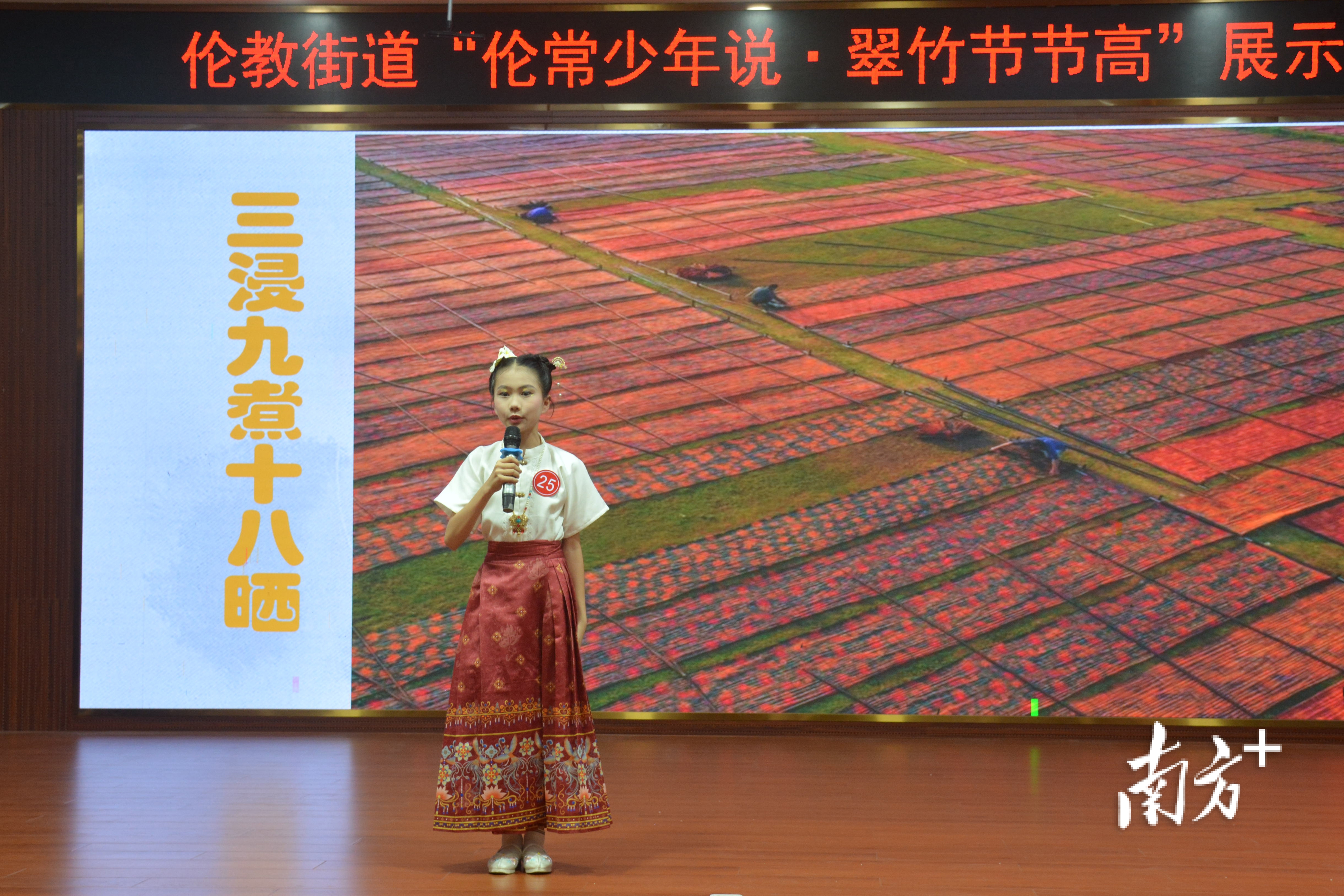 展示现场,孩子们用稚嫩却坚定的声音,带领观众走进伦教的街头巷尾、古建田园。当舞台的屏幕亮出三洲水乡美景时,参赛选手将梁棉爷爷捐出建房款、奔走筹建三洲中学的故事、将“咬定青山不放松”的坚韧娓娓道来;屏幕切换到鸣石花园的八角亭下,孩子们借何鸣石先生远渡重洋、心系故土的事迹,诠释“虚心有节、不忘根本”的家国情怀;切换到香云纱晒莨场,选手们分享亲手涂抹薯莨汁、铺河泥的体验,感悟“三蒸九煮十八晒”背后的匠心与坚守。