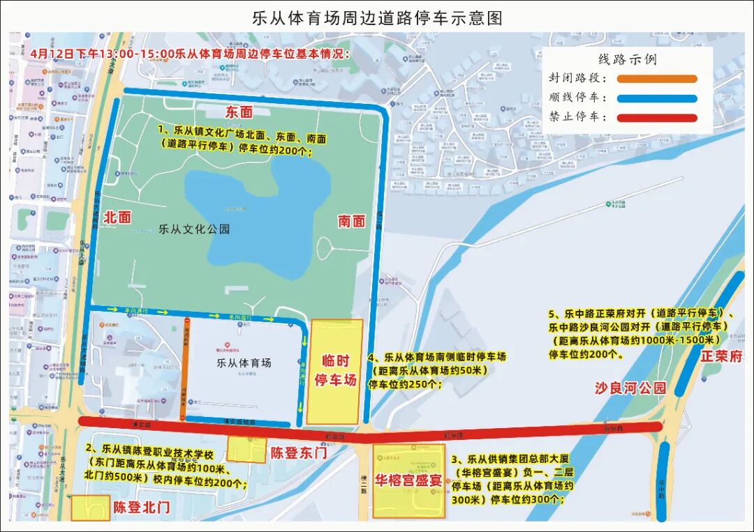 5、乐中路正荣府对开(道路平行停车)、乐中路沙良河公园对开(道路平行停车)(距离乐从体育场约1000米-1500米)停车位约200个。