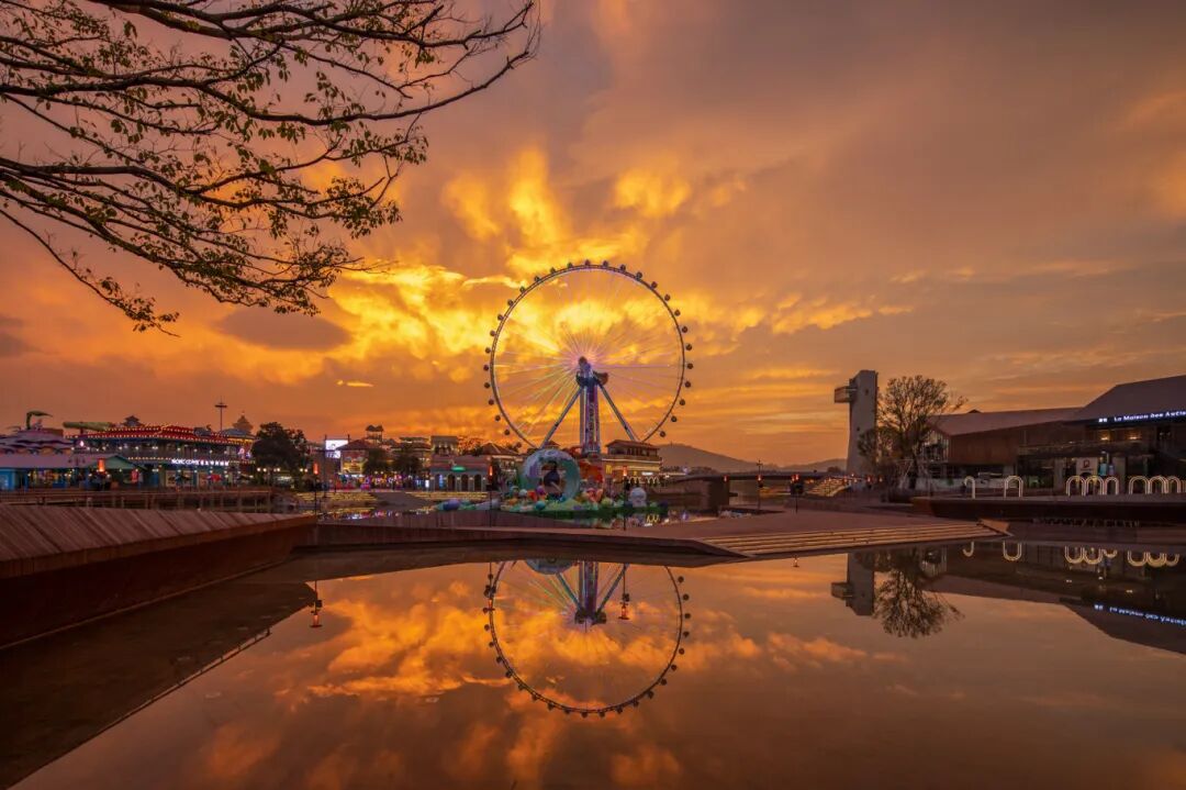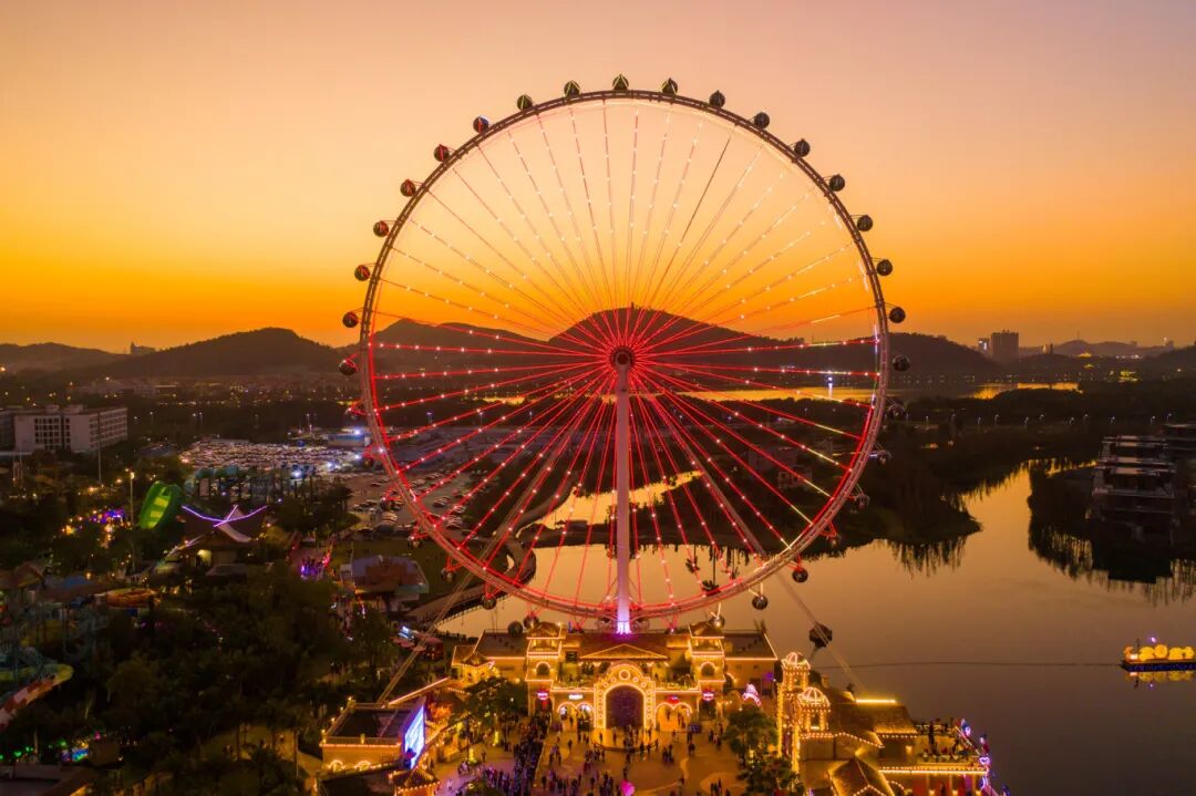 巨大的摩天轮配上橘黄色晚霞