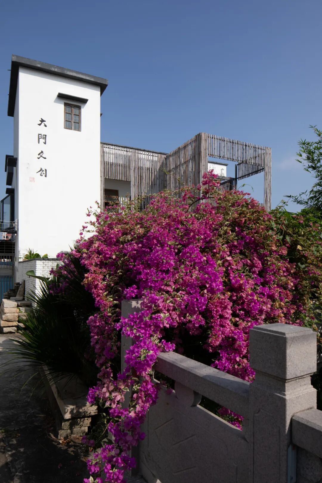 青瓦白墙与绿植相映
