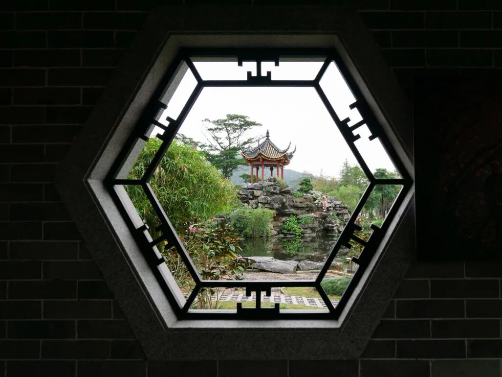 园中的假山、锦鲤与漏窗