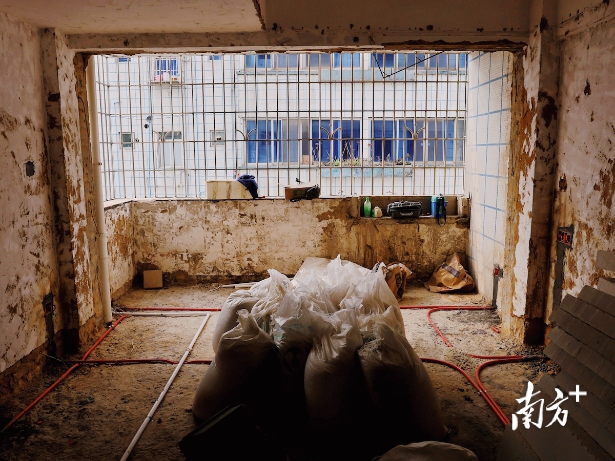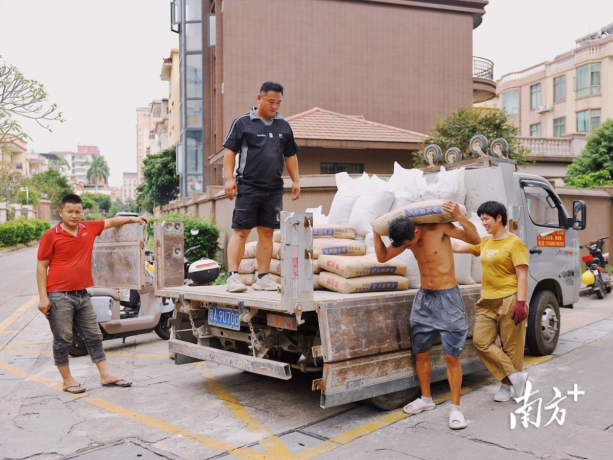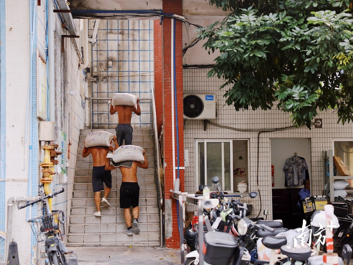 广州花都,千禧年老楼蓝白色外墙洇着雨水渍痕,老楼侧肋新装了电梯,但扛楼工们不会用它。“不合规矩。”魏云桂说。她扛着水泥袋,弓着腰走一旁的旧楼梯,狭窄、积灰、一阶一阶通向七楼。偶尔有风吹过楼道,拂起她额前的短发,吹落头发上的白色砖屑。