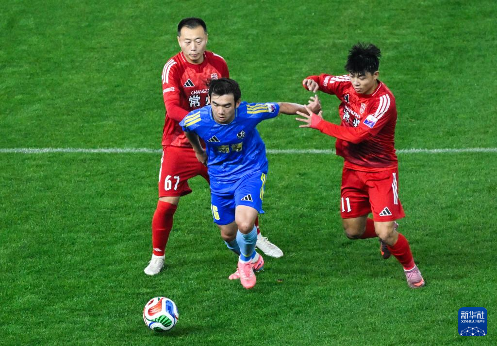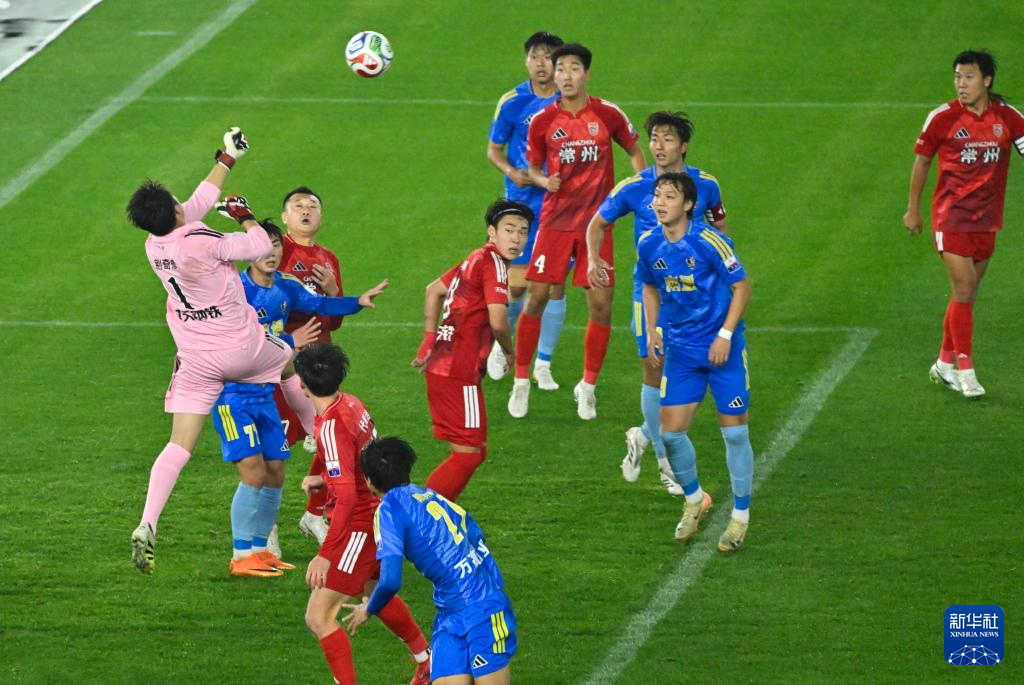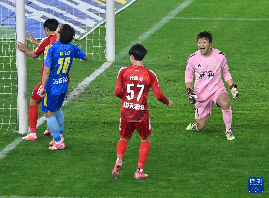 4月11日,常州队门将别奇修(右一)在比赛中。