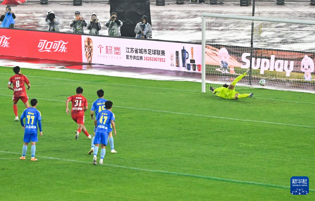 4月11日,常州队球员王宏宇(左一)在比赛中点球破门。
