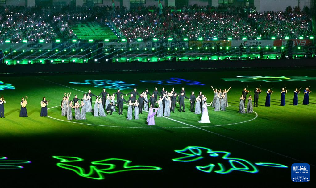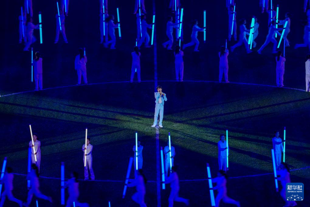 4月11日,歌手周深(中)在开幕式上表演。