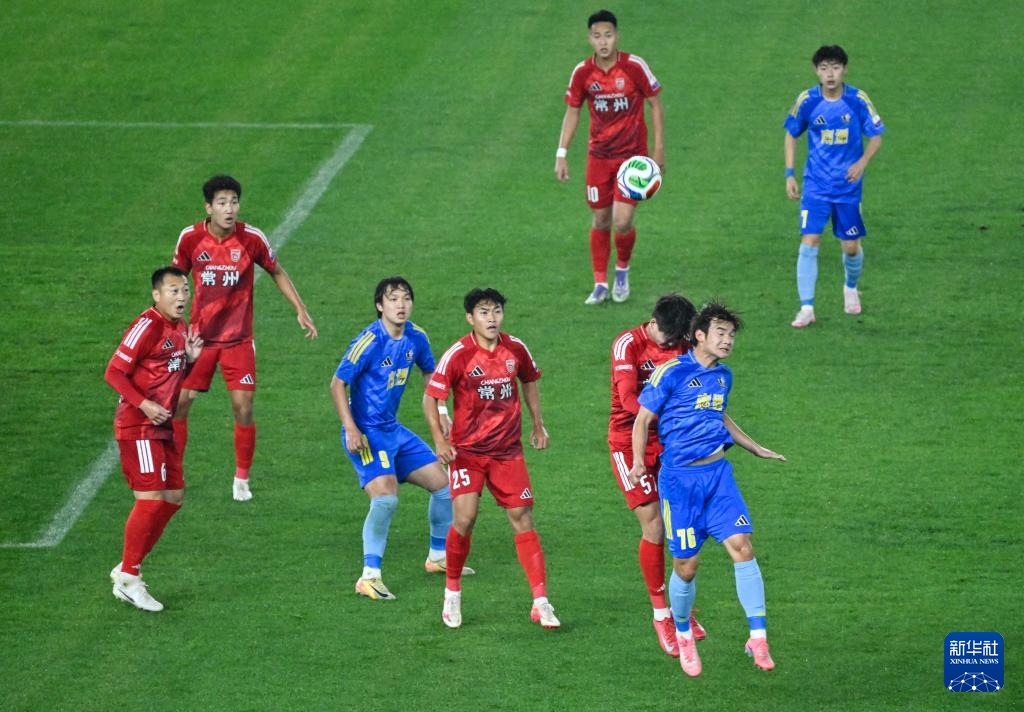 4月11日,南通队球员潘万权(下,右一)与常州队球员代晨治(下,右二)在比赛中争顶头球。
