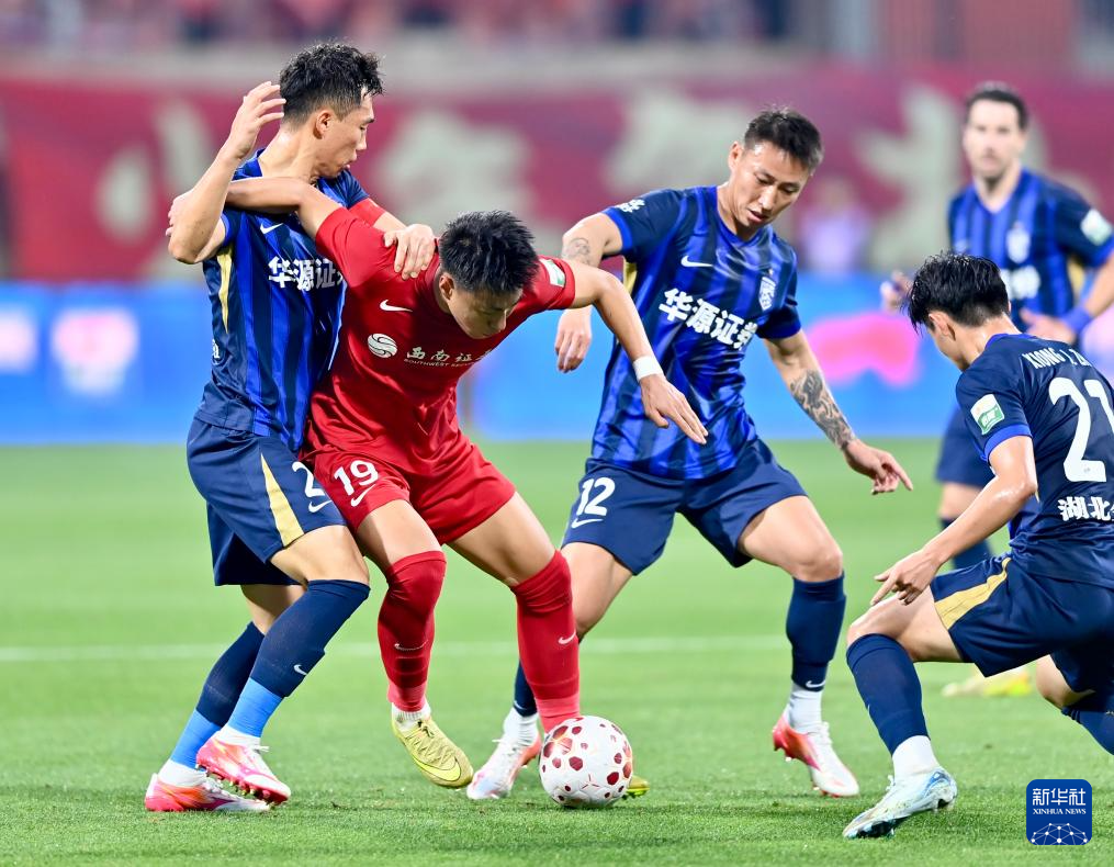 4月11日,重庆铜梁龙队球员杜月徵(左二)与武汉三镇队球员贺惯(左一)在比赛中拼抢。