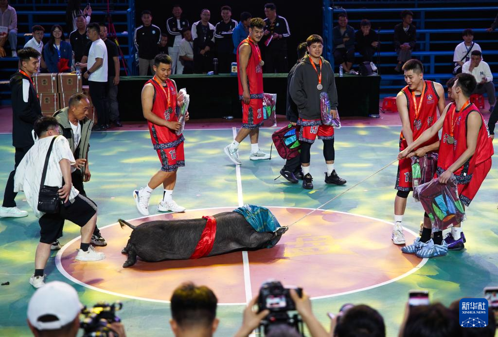 4月11日,获得亚军的沿河县代表队在颁奖仪式上,他们获得的奖品是当地黑毛猪。