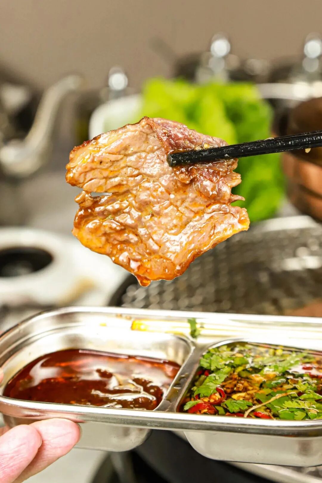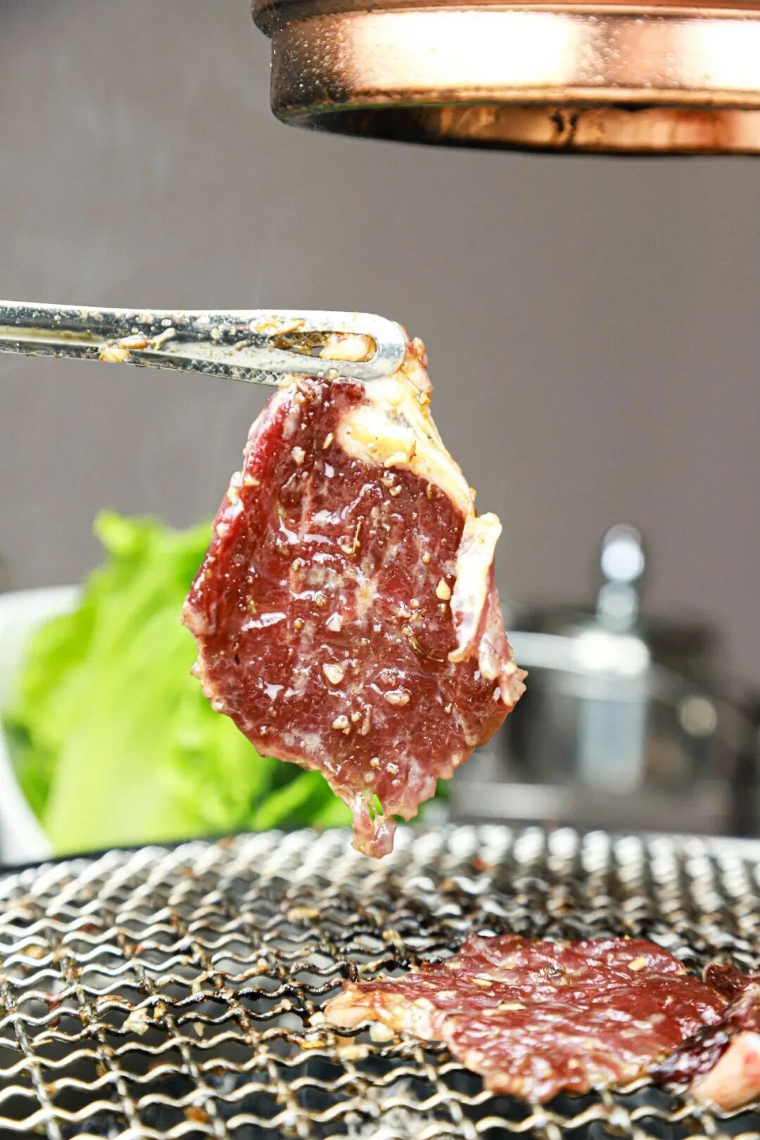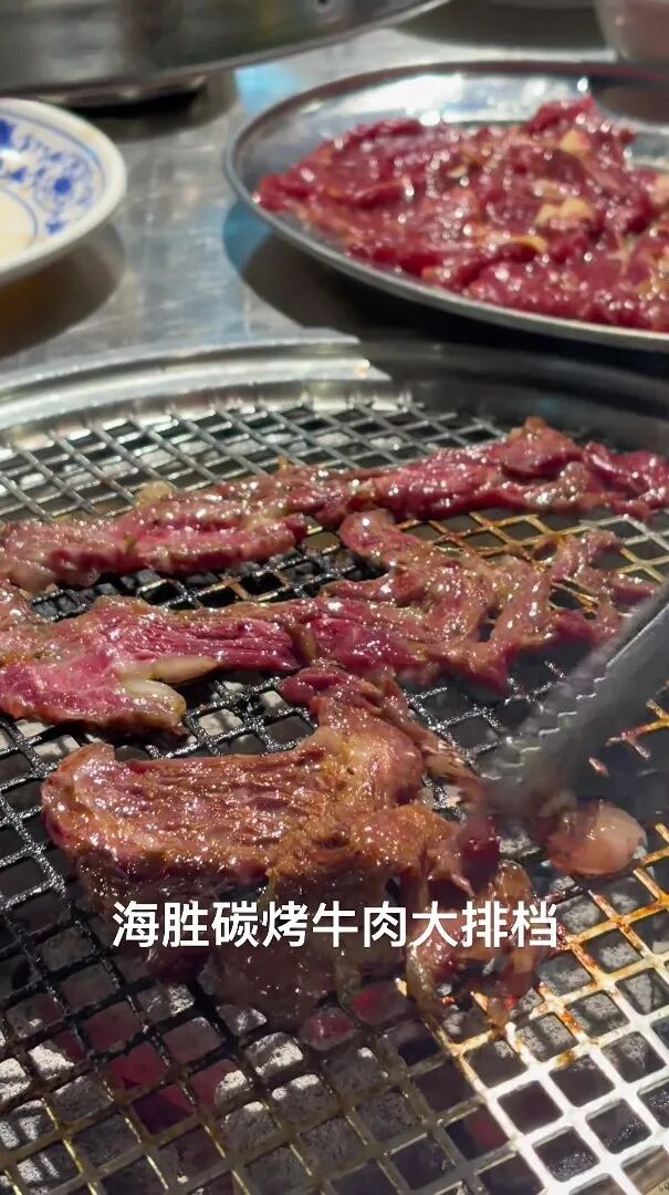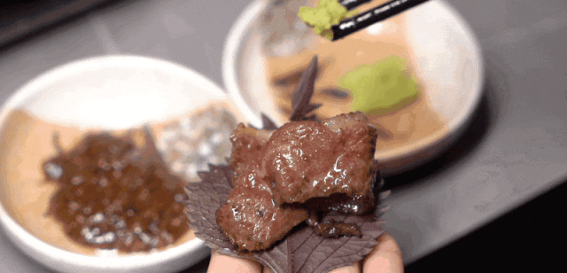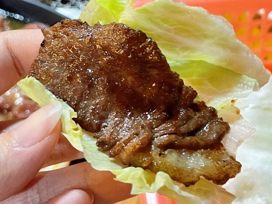 炭烤/铁板鲜牛肉,外皮焦香、内里爆汁,搭配秘制酱料,裹上生菜或紫苏叶,一口封神