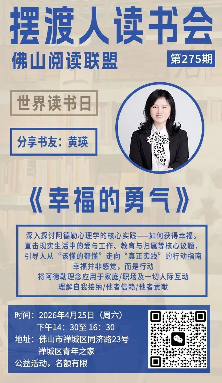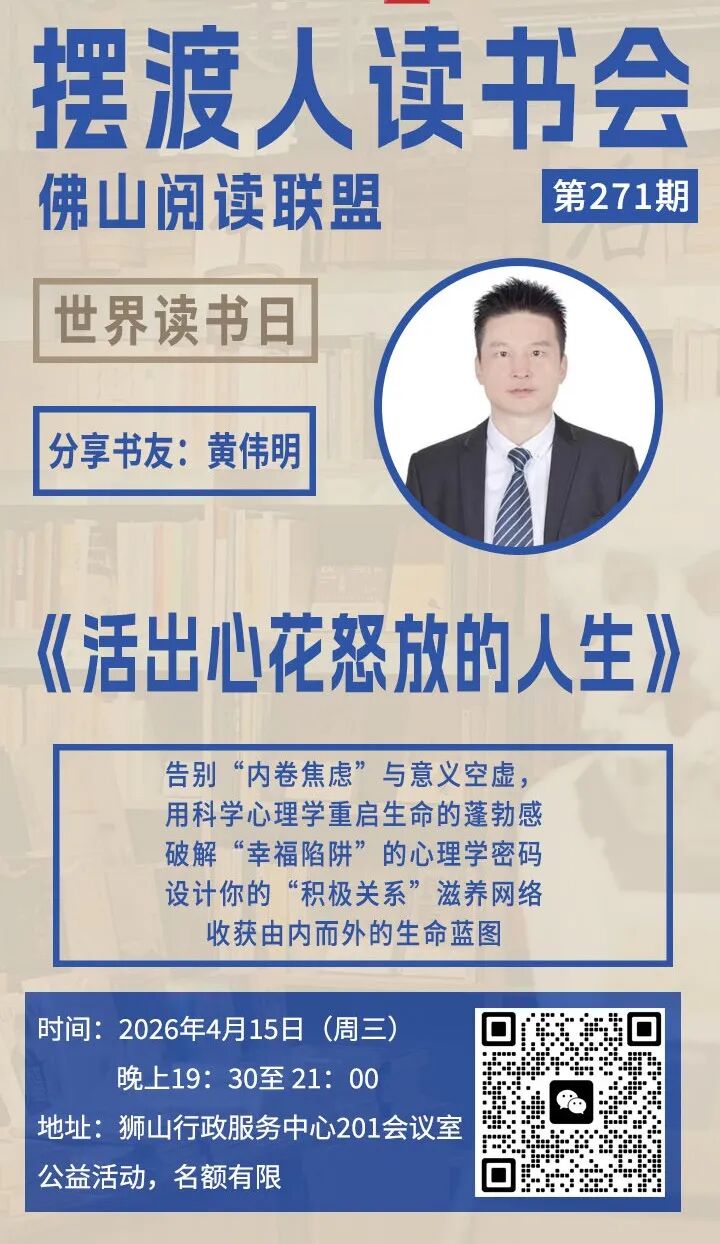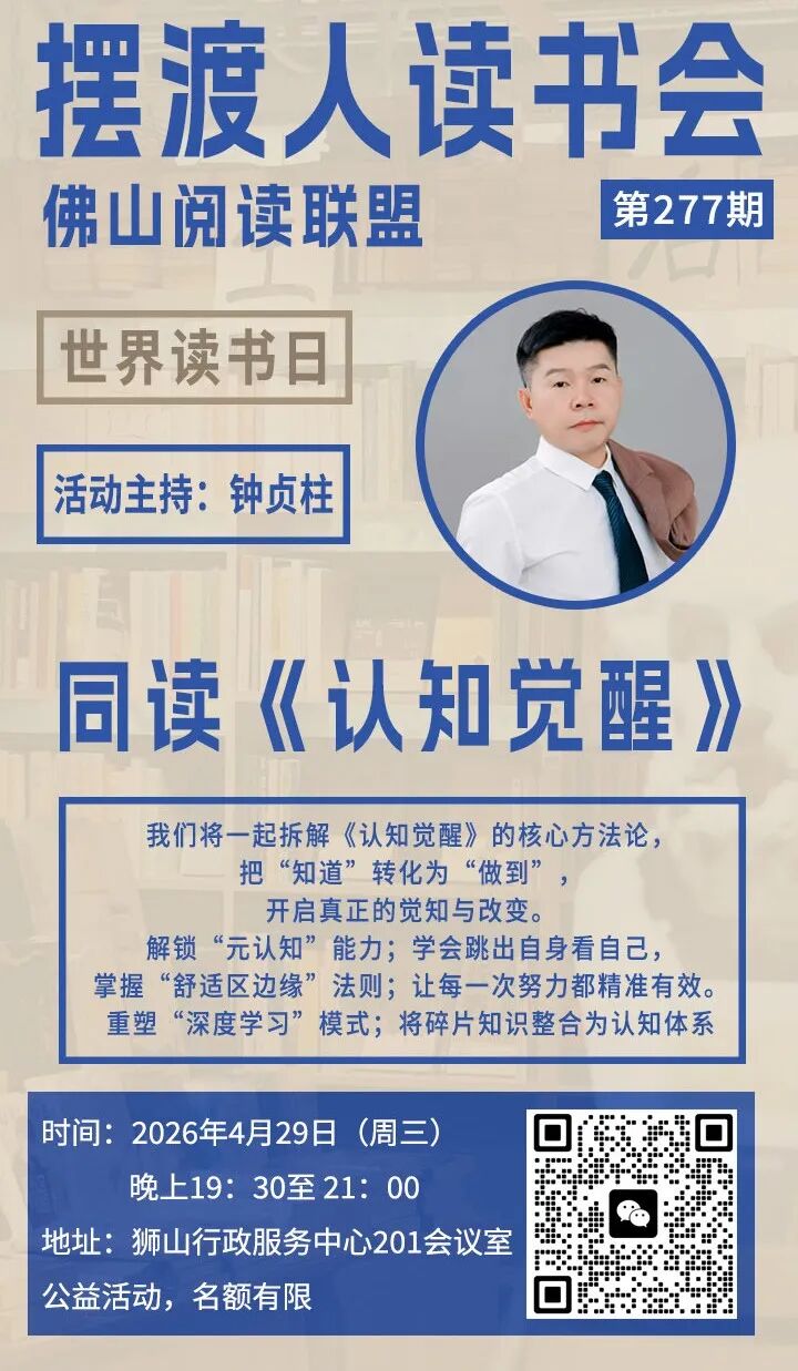 为迎接2026年“世界读书日”,佛山阅读联盟摆渡人书店将于4月举办系列主题阅读盛会。本次活动以深度学习与自我进化为核心,精心策划了涵盖心理健康、职场突破、科学育儿及国学智慧的七场主题分享会,包括《活出心花怒放的人生》《岗位胜任力》及《认知觉醒》等。通过高密度的知识输出与互动交流,旨在引导读者告别成长焦虑,掌握科学的思维与行动系统,在书香中寻回幸福的勇气,全方位提升个人影响力与心理韧性,开启一场春日里的认知觉醒之旅。