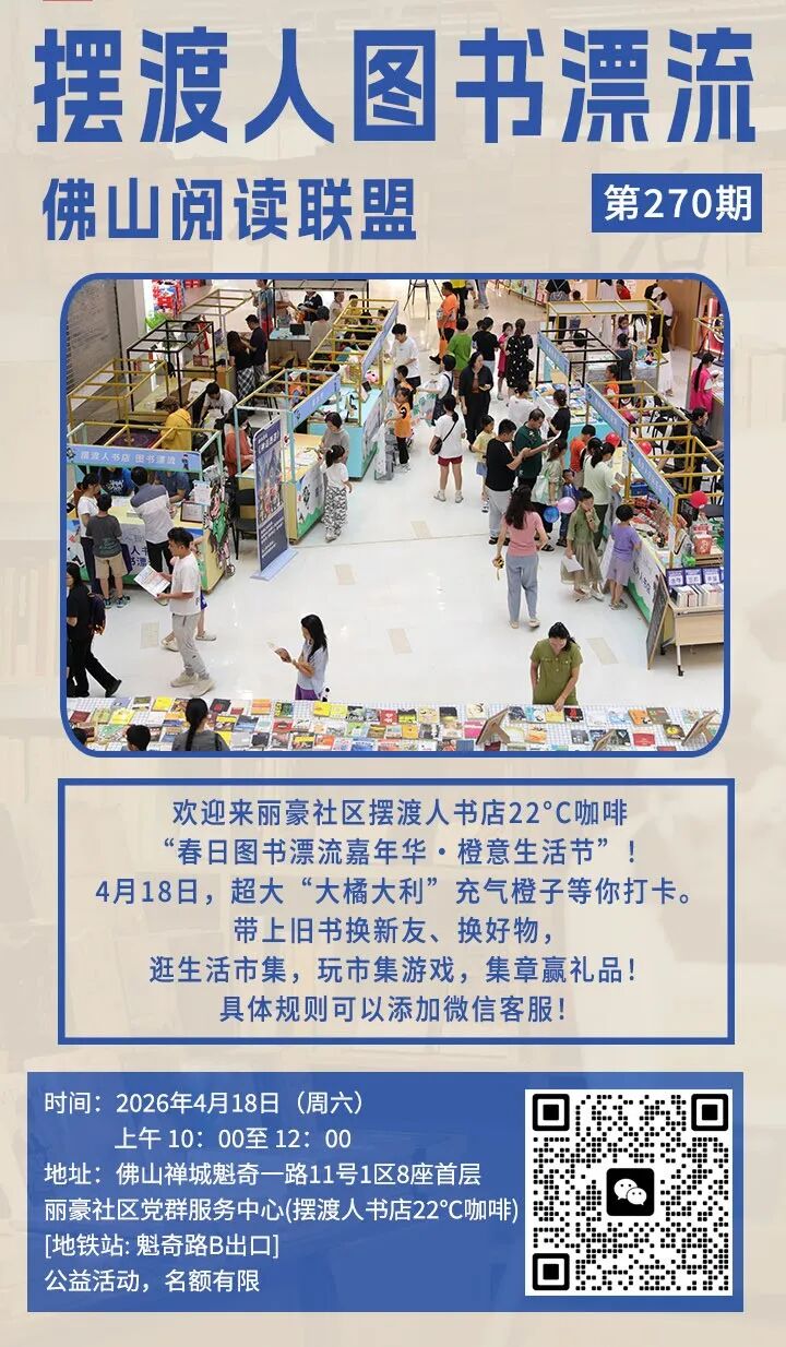 图书漂流嘉年华·橙意生活节 | 4月18日 (周六) 10:00-12:00 | 丽豪社区党群服务中心 (摆渡人书店22℃咖啡) |