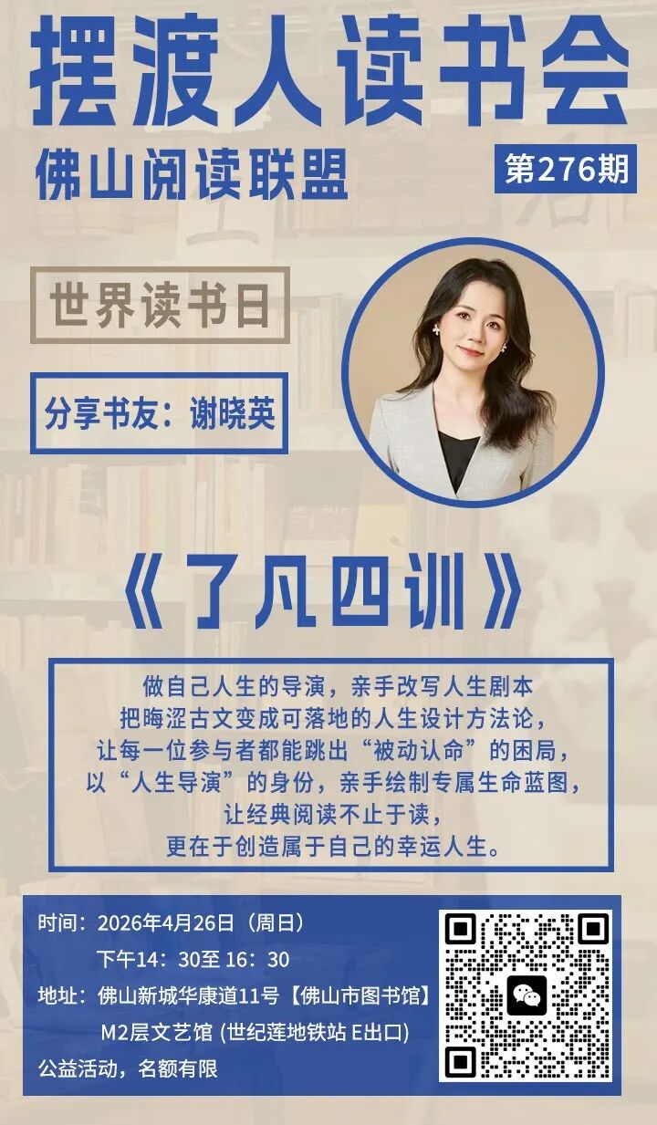《了凡四训》分享会 | 4月26日 (周日) 14:30-16:30 | 佛山市图书馆主馆 M2层文艺馆 |