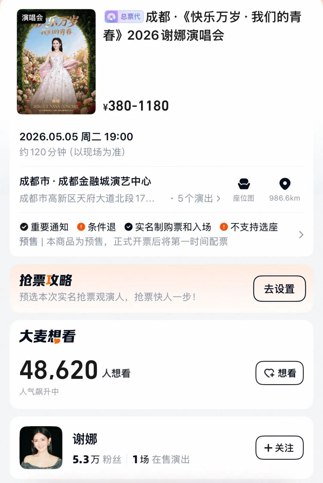 极目新闻记者注意到,谢娜个人演唱会成都站截至发稿时想看人数已超4.8万,票价380元至1180元不等。据悉,谢娜曾在2月的直播中表示:“我那些歌也要拿出来见人了。”