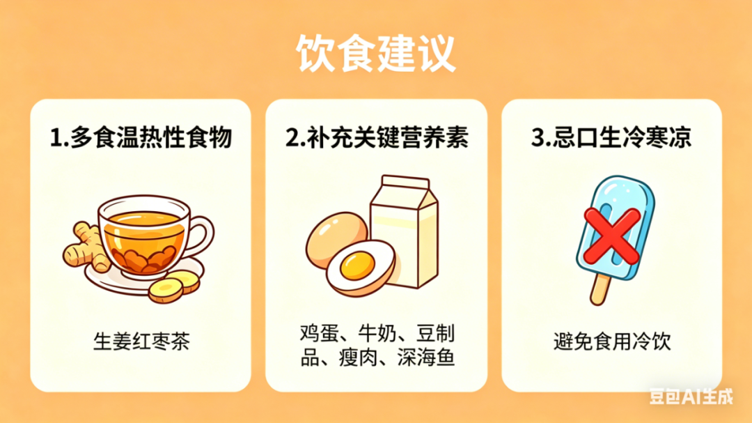 1.多食温热性食物:适量食用生姜、葱、蒜、羊肉、牛肉、核桃、桂圆等温补食材。可常饮生姜红枣茶、当归生姜羊肉汤(不宜过频)等药膳。