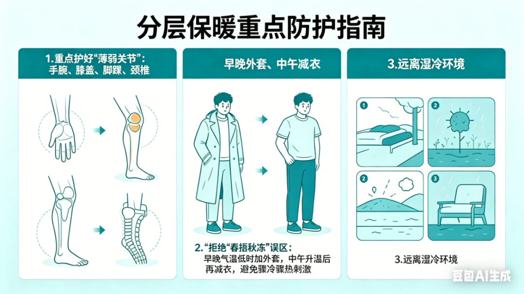 1.重点护好“薄弱关节”:手腕、膝盖、脚踝、颈椎是风湿高发部位,避免冷风直吹;夜间睡觉用薄被盖住关节,防止受凉。