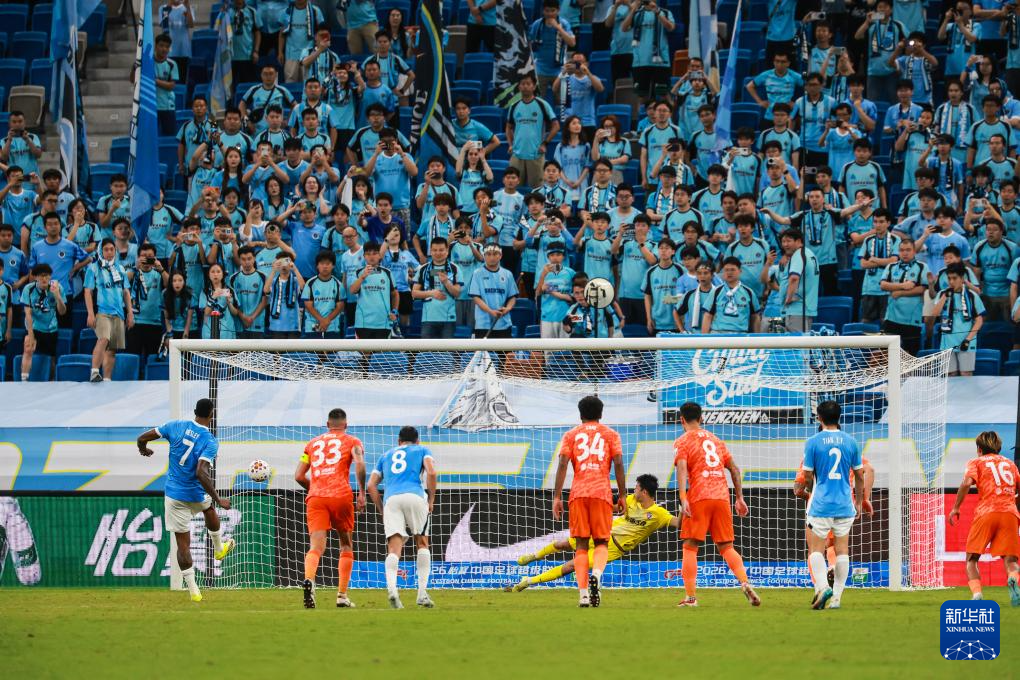 4月12日,深圳新鹏城队球员韦斯利(左一)在比赛中罚进点球。
