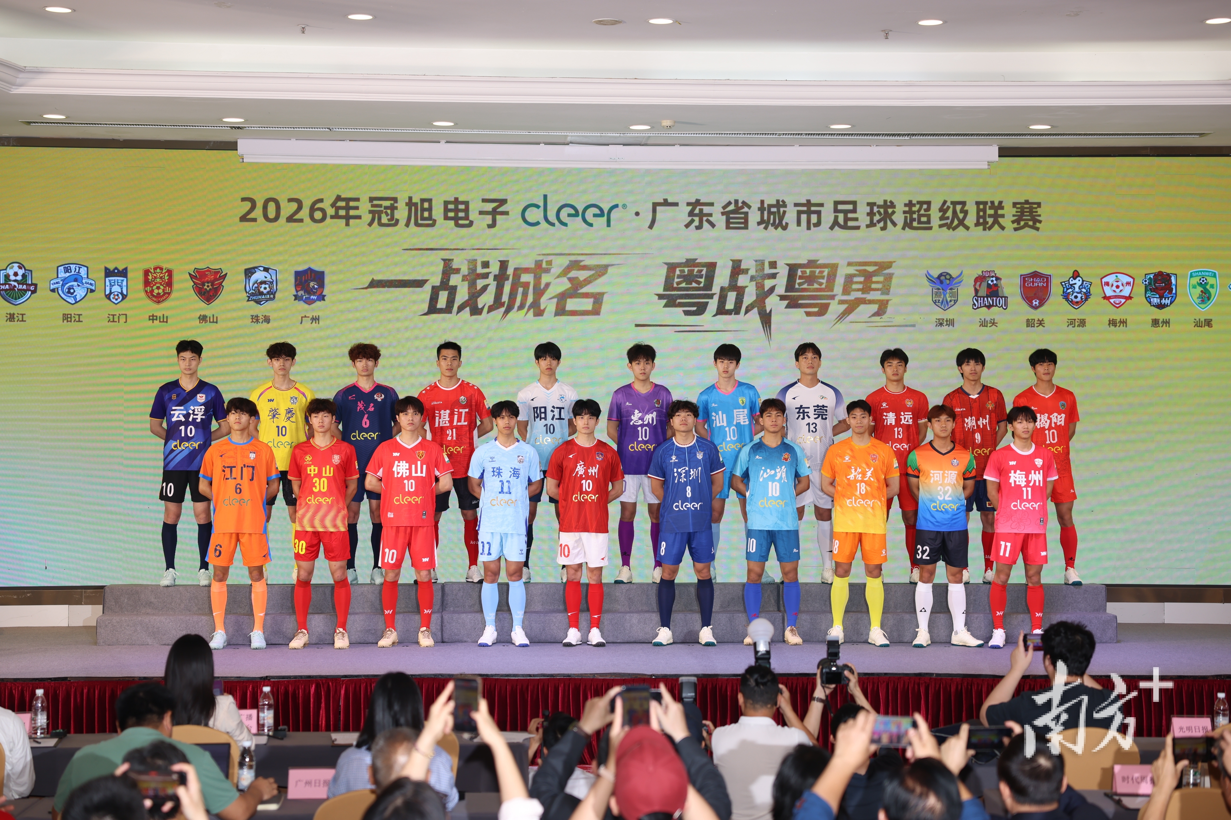粤超21城球衣出炉!4月13日下午,2026年广东省城市足球超级联赛新闻吹风会在广州举行。会上,全省21个地级以上市参赛队伍现场展示球衣。