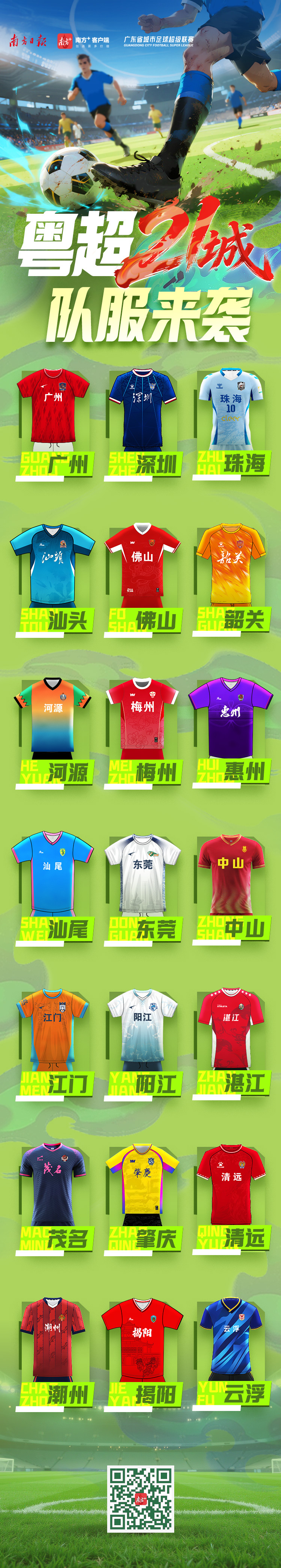 这些城市战袍,承载着所在城市的精神,展现了广东足球的蓬勃活力,一图速览21队球衣——