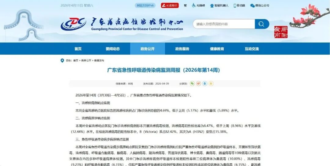 近日,广东省疾病预防控制中心发布的监测周报显示,2026年第14周(3月30日—4月5日)全省报告流感样病例暴发疫情1起,发生在学校,已采取有效控制措施。