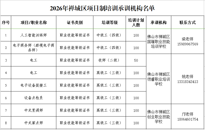 为深入贯彻落实“投资于人”理念,加快构建“终身学习、人人出彩”的终身学习体系,营造“技能照亮前程、人才赋能产业”良好氛围,佛山市禅城区人力资源和社会保障局正式启动2026年禅城区项目制技能培训报名工作。