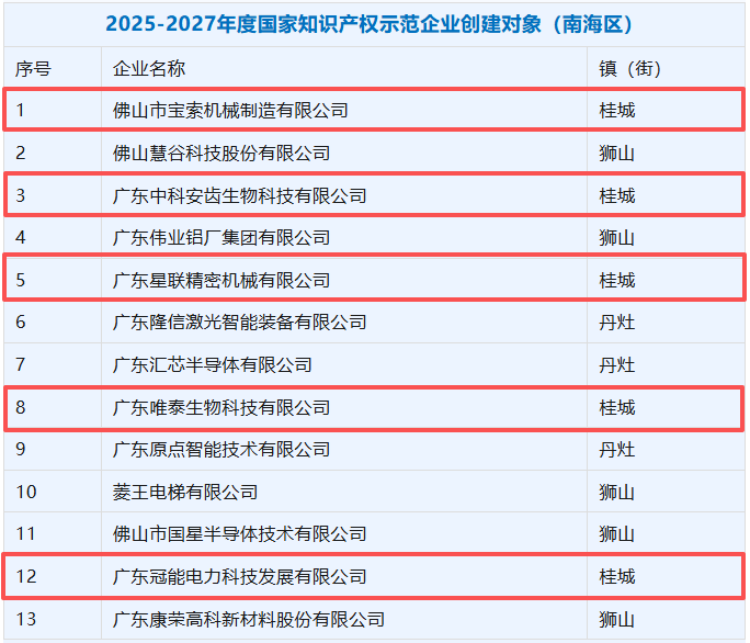 近日,国家知识产权局发布《国家知识产权局关于确定2025—2027年国家知识产权强国建设示范创建对象的通知》,佛山市宝索机械制造有限公司等13家南海区企业入围国家知识产权示范企业创建对象,数量居全市第一,全省县区级第三。