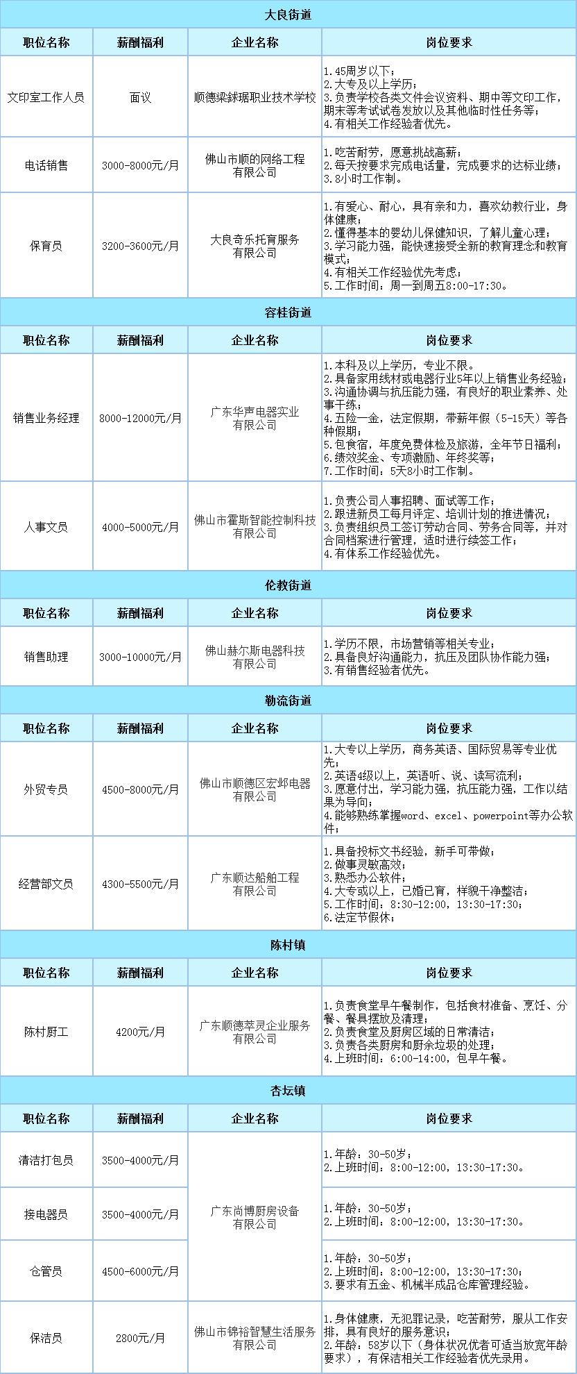 找工作的小伙伴注意啦! 顺德上新一批优质靓岗 来看看有无心水的吧~ 佛山市顺德区职工解困基金会 公开选聘专职秘书长人选的公告 招聘岗位 因工作需要,佛山市顺德区职工解困基金会现面向社会公开选聘专职秘书长人选1名。 薪酬待遇 1.年度薪酬总额12万元/年(含单位及个人缴纳的五险一金、各类补贴及福利费);2.试用期3个月,试用期工资按约定工资的80%发放;3.按规定缴纳五险一金,享受年度考核、薪酬调整与绩效激励机制。 报名时间 即日起至2026年4月16日 点击此处查看招聘详情 广东顺北集团有限公司 投资运营岗公开招聘公告 招聘岗位 投资运营岗1名 薪酬待遇 公告期满无异议的,按规定办理录用手续,签订劳动合同,并按照集团规定享受相应的薪酬和福利待遇。录用人员按规定实行试用期制度,试用期期间或试用期满不合格的,取消录用。 报名时间 即日起至2026年4月14日 招聘详情链接 http://www.shunde.gov.cn/sdbjz/tzgg/qt/content/post_7131488.html 顺德自然科学馆招聘通知 顺德自然科学馆位于广东省佛山市顺德区北滘镇市民活动中心负二层,设有主展厅、临时展厅、多功能教室、考古挖掘体验厅、文创商店等相应的配套功能空间。 招聘岗位 讲解接待员 1名 薪酬待遇 1.工作时间为周二至周日8:30-12:00,14:00-17:30;节假日正常上班;逢周一闭馆。2.购买社保;薪资待遇面议。 点击此处查看招聘详情 广东顺德勒控集团有限公司 2026年第一期人员招聘公告 招聘岗位 大凤岗主管、储备项目经理 薪酬待遇 1、一经录用,双方签订《劳动合同》,薪酬待遇按勒控集团有关规定执行;拟到岗时间为2026年6月前;2、每年为员工进行全面医疗体检;3、五天工作制,节假日按国家法定假期休息,依法享受年假、婚假等各种有薪假期。 报名时间 即日起至2026年4月16日 点击此处查看招聘详情 均控餐饮招聘业务拓展岗 招聘岗位 薪酬待遇 (一)一经录用,薪酬待遇按企业相关薪酬体系执行; (二)工作时间参照所属企业的工作时间,依法享有法定带薪假期; (三)五险一金。 报名时间 即日起,至招到合适人选为止。 点击此处查看招聘详情 星宇社会工作服务中心招聘公告 佛山市顺德区星宇社会工作服务中心成立于2011年3月,由顺德区热心公益服务的团队发起,是顺德首家本土社会工作服务中心。 招聘岗位 1.医务服务社工(伦教 1名),月薪4500-5500元/月 2.医务社工(伦教 1名),月薪3800-4500元/月 3.精康服务社工(大良 1名),月薪4000-5000元/月 薪酬待遇 (1)全面保障:按国家有关规定签订劳动合同,享五险一金; (2)假期及福利:双休五天工作制、法定节假日带薪假、带薪年假、节日慰问、年度体检、工作餐补贴等多项福利; (3)团建活动:季度生日会、年度旅游、年度团建拓展活动等形式多样的团队活动; (4)成长发展:提供多种管理能力培训、专业能力提升培训、外出参观交流学习、一对一督导培训等。 点击此处查看招聘详情 北滘镇莘村初级中学招聘后勤人员公告 招聘岗位 饭堂厨工、校园工勤人员、校园保洁等后勤人员若干名。 薪酬待遇 参照《莘村初级中学后勤人员工资方案》并结合实际情况执行,每月按时发放。 报名时间 即日起至2026年4月25日 点击此处查看招聘详情 顺德区成美初级中学 诚聘宿舍生活老师的公告 成美初级中学是地处顺德新城区的一所全日制公办初级中学。 招聘岗位 生活老师1名 薪酬待遇 待遇面议。 报名时间 即日起至2026年4月15日前 点击此处查看招聘详情 顺德梁銶琚职业技术学校 招聘公告 佛山市顺德区梁銶琚职业技术学校创办于1988年,是国家级重点中职学校、广东省高水平中职学校建设单位。因学校发展需要,现面向社会公开招聘工作人员若干名,具体事宜公告如下: 招聘岗位 薪酬待遇 待遇面议。 报名时间 本招聘公告长期有效,招满即止。 点击此处查看招聘详情 此外,还有这些岗位等你报名 若上方表格内有你心仪的岗位 可扫描下方二维码咨询 (小云老师 13725330324)