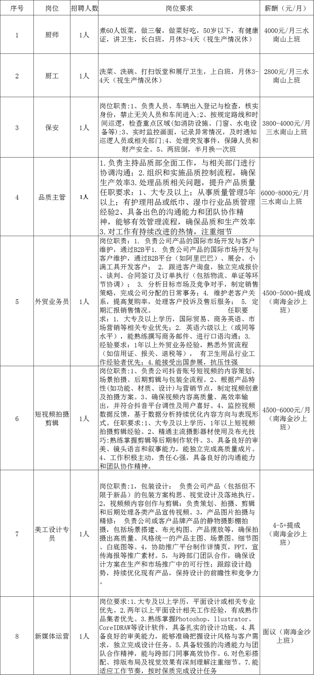 3、公司为员工免费提供食宿;住宿2-4人间(配有空调、热水、独立卫生间);