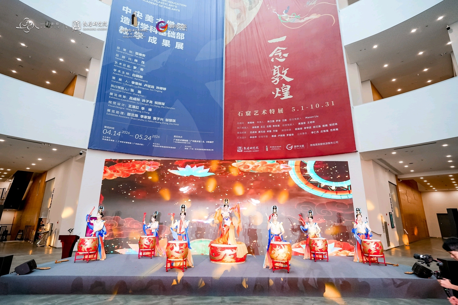 活动现场播放了整窟复原纪实短片、“一念敦煌”亮点预告片及敦煌研究院美术研究所临摹工作花絮,营造出浓厚的敦煌氛围。随后,敦煌鼓乐震撼开场。广州艺术博物院领导、敦煌研究院专家、国强公益基金会代表及出品人、策展人先后发言,深入阐释大展的学术价值、展览亮点与社会意义。各界近百位嘉宾共同见证这一湾区文化盛事。