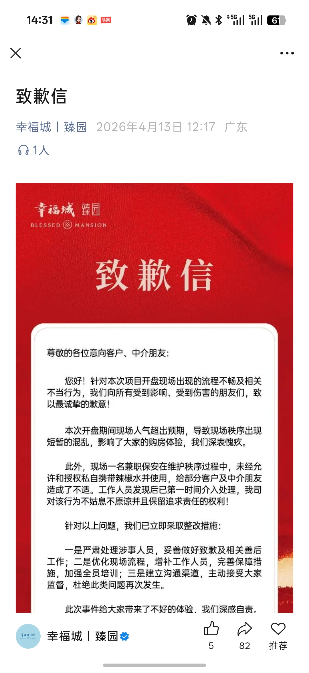 4月13日中午,涉事楼盘发布致歉信称,开盘期间现场人气超出预期,秩序出现短暂混乱。一名兼职保安在维护秩序时,未经允许私自携带并使用辣椒水,导致部分客户及中介人员不适。工作人员发现后已第一时间介入,同时严肃处理涉事人员,并将优化现场流程、增补工作人员、加强全员培训,杜绝此类事件再次发生。