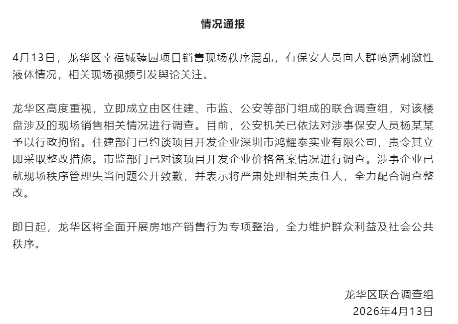 4月13日晚,龙华区发布情况通报,该区已立即成立由区住建、市监、公安等部门组成的联合调查组,对该楼盘涉及的现场销售相关情况进行调查。目前,公安机关已依法对涉事保安人员杨某某予以行政拘留。住建部门已约谈项目开发企业深圳市鸿耀泰实业有限公司,责令其立即采取整改措施。市监部门已对该项目开发企业价格备案情况进行调查。涉事企业已就现场秩序管理失当问题公开致歉,并表示将严肃处理相关责任人,全力配合调查整改。