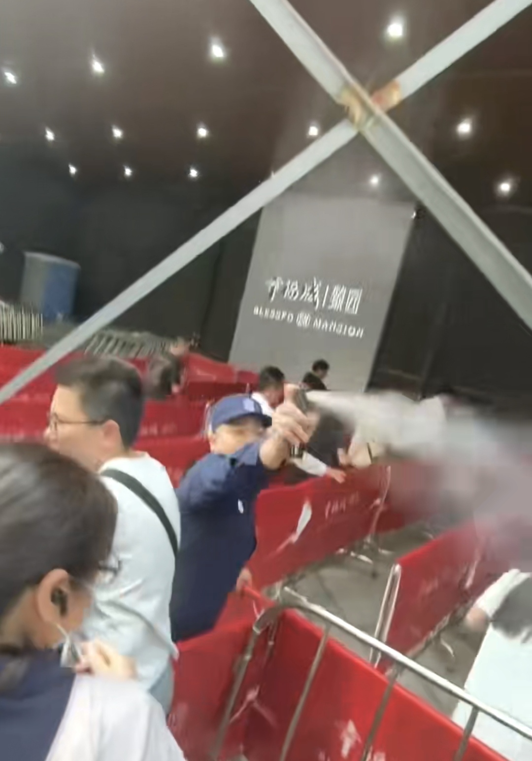 网络流传视频显示,一名保安对着楼盘排队人员喷洒辣椒水,现场人员捂住口鼻、惊慌逃离。