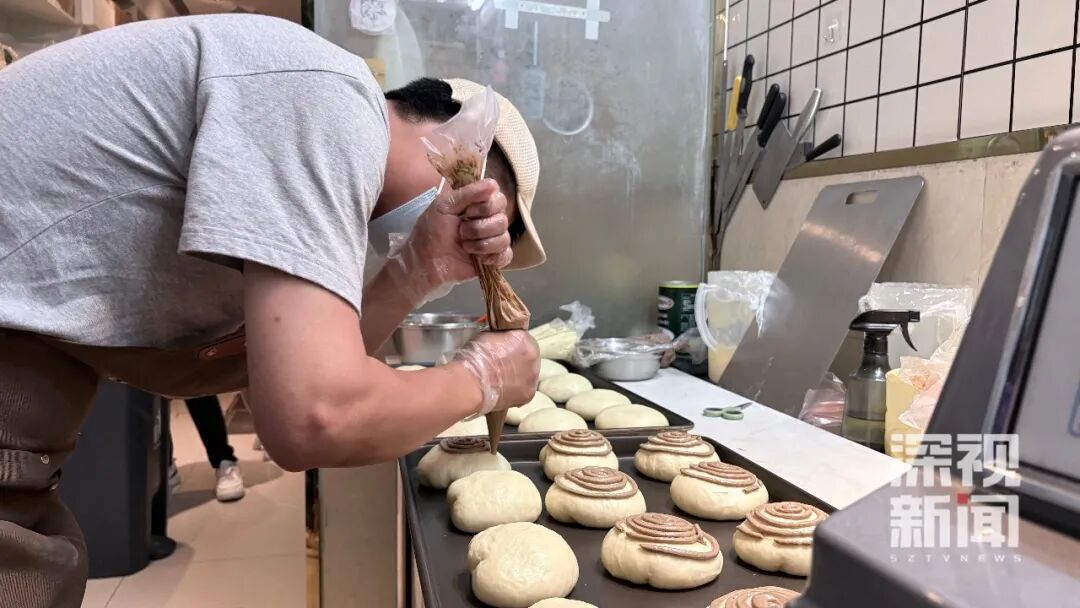 早上6点半左右,深视新闻记者来到面包店看到,店员们正在制作新鲜的面包,挤奶油、刷蛋液、烘烤......忙得不亦乐乎,烘焙特有的麦香在店内肆意弥漫,让空气也变得温暖、香甜。