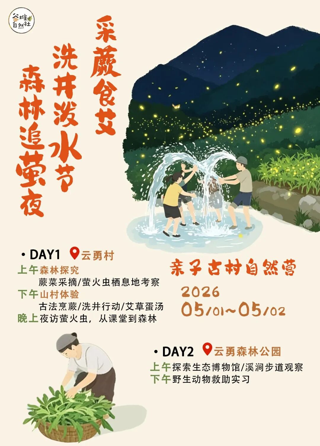 换好干衣服,挎上篮子去村边田埂采鲜嫩的艾草。回到森林厨房,导师带着大家煮一锅艾草鸡蛋汤。一人一碗,暖呼呼的,正好驱散洗井时沾的凉气。