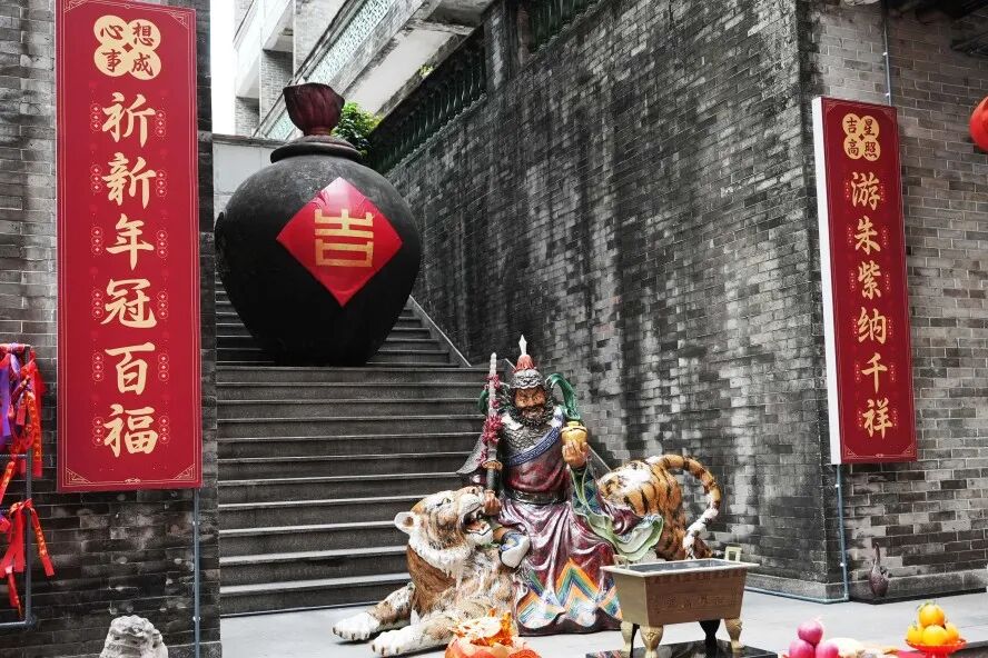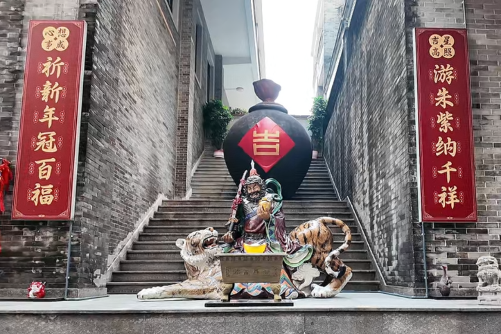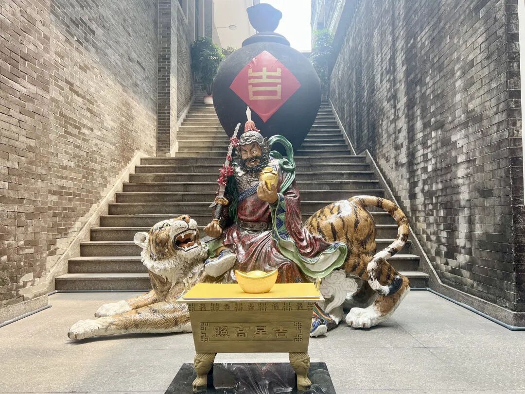 朱紫街,这条承载石湾千年商贸记忆与民俗基因的古街,向来以“游朱紫·大红大紫”的民俗活动承载市民对美好和欢乐生活的祈愿。如今,朱紫街请来了武财神陶塑非遗艺术作品,让“吉运”与“财运”在古街时空里交织共生:雕塑坐落于朱紫街的核心区域,背后“吉”字大酒坛呼应“拜吉星”民俗愿景,武财神赵公明的威严和猛虎坐骑,与古街两侧的红灯笼和浓郁的传统文化氛围相得益彰……传统非遗以艺术造像形式融入街巷肌理,既延续了朱紫街“烟火气里的文化味”,更开启了“非遗活化赋能文旅”的全新叙事,让千年朱紫街区成为可体验、可触摸、可传播的文化磁场。