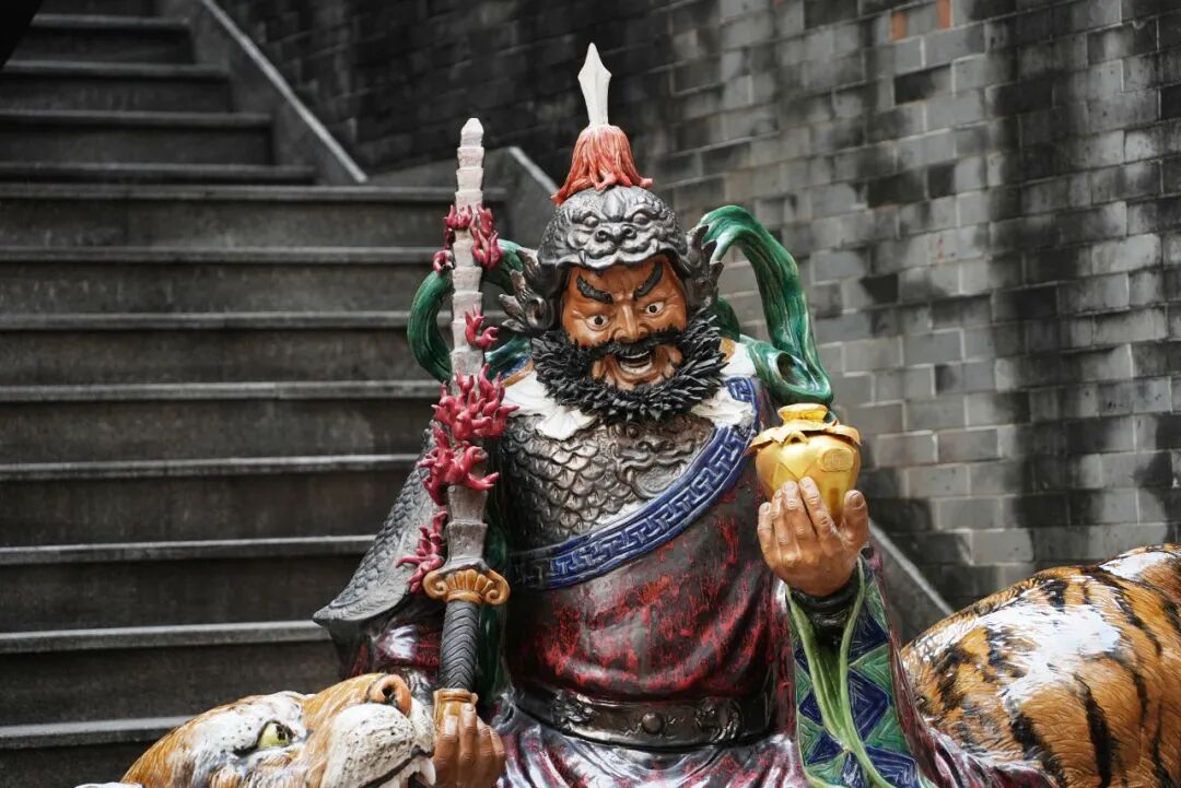 聚焦武财神的雕塑本身,其艺术匠心与工艺水准尽显石湾陶塑“泥、釉、火”三位一体的非遗精髓。武财神赵公明塑造为右手持锏、左手托金酒瓶(因为朱紫街的核心区域位于广东石湾酒厂集团总部基地内,为了结合酒文化,金元宝改成酒瓶),端坐猛虎背上的威武造型。人物神态刚毅豪迈,衣饰纹理流畅自然,虎兽毛发筋骨毕现,整套造像以“一体烧制”技艺完成——突破传统陶塑尺寸限制的同时,精准还原民俗信仰中武财神“招财镇宝”的精神意象。创作该作品的艺术家透露,作品从设计到烧制历时数年,团队攻克大体量陶塑“釉色均匀、结构稳固”等技术难题,力求让非遗技艺在当代创作中既“守根脉”又“开新局”。