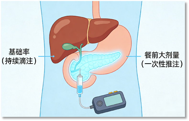 持续微量输出,控制你空腹、睡觉、两餐之间的基础血糖,专门对付传统胰岛素注射难控的“黎明现象”(清晨血糖飙升)和夜间低血糖。